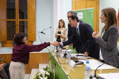 el delegado territorial de Desarrollo Educativo y Formación Profesional y de Universidad, Investigación e Innovación en Almería, Francisco Alonso, saluda a la directora de la UNED en Almería, María del Carmen Pérez.