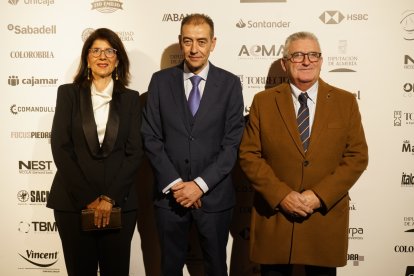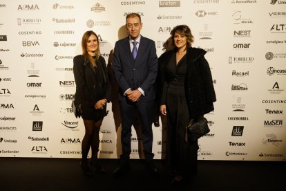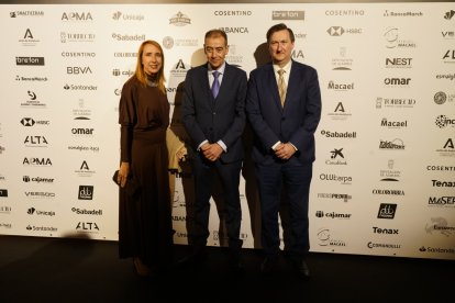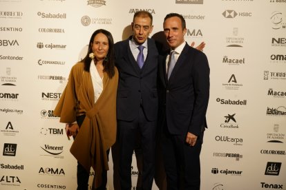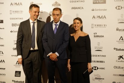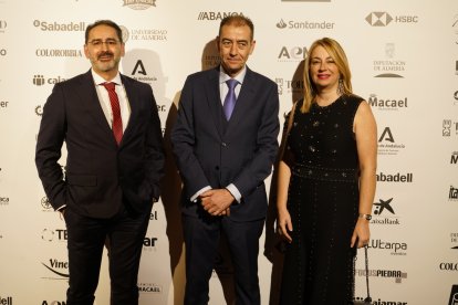 Premios Macael 2025: Esther Moya, de CaixaBank; Jesús Posadas, presidente AEMA; Joaquín Guirado, CaixaBank.