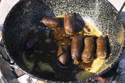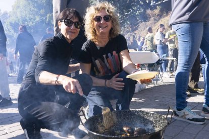 Las almerienses Beatriz Tesón y Rosa María Hernández, cocinando morcillas para acompañar sus migas de sémola.