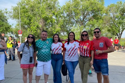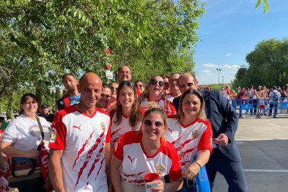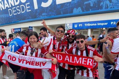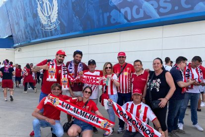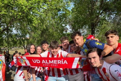 Los aficionados de la UD Almería llegan a Butarque, el estadio del Leganés donde esta tarde se juega el ascenso a Primera División.