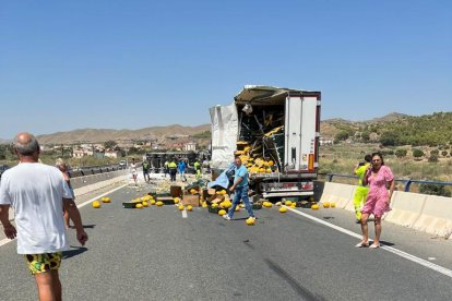 Un accidente entre dos camiones en el puente del Río Almanzora que ha dejado a uno de los conductores fallecidos y uno de los vehículos colgando del puente.