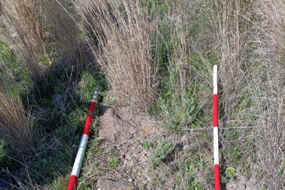 Muro reutilizado de la balsa en el que se pueden distinguir dos partes diferenciadas