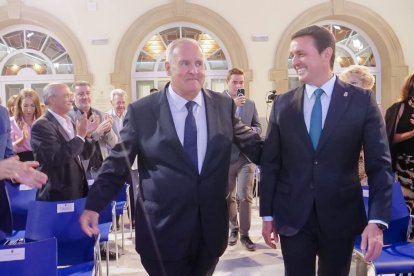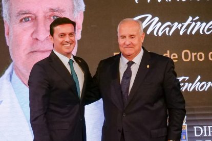 Martínez Amo besa el Escudo de Oro recién impuesto ante Javier Aureliano García.