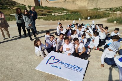 Entre el Sagrado Corazón de Jesús y la Alcazaba de Almería, muestra inequívoca del cruce de civilizaciones que es nuestra sociedad almeriense, los alumnos de los centros educativos Amor de Dios, San Francisco, Virgen de la Chanca, CEIP La Chanca, Giner de los Ríos y Mater Asunta recitaban 'Versos por la Paz' en pleno Jardín Mediterráneo de La Hoya. Lo hacían acompañados por la delegada del Gobierno, Aránzazu Martín, la alcaldesa de Almería, María del Mar Vázquez, así como el delegado de Educación, Francisco Alonso Martínez, y varios concejales del Ayuntamiento. Un acto de hermanamiento y de fiesta para simbolizar la importancia de seguir trabajando cada día por la paz entre los más jóvenes, sobre todo en estos tiempos de guerra.