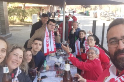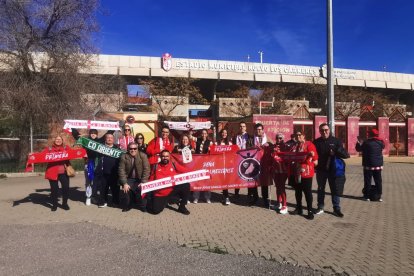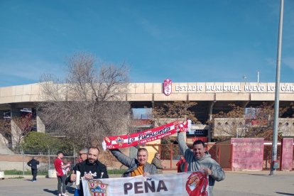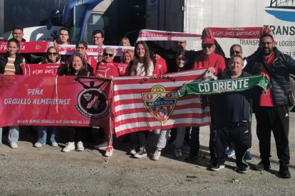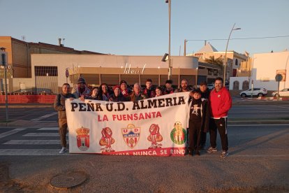 Peñistas de Orgullo Almeriense y de La Fuensanta antes del partido de su Almería del alma en Granada.