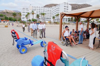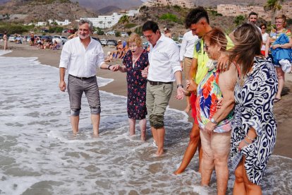 Los tres protagonistas que hoy han hecho realidad su deseo han estado acompañados en la playa Venta del Bancal por el presidente de la Diputación de Almería, Javier A. García; el alcalde de Mojácar, Fran García; el vicepresidente y diputado de Bienestar Social, Ángel Escobar; el gerente de Atende, Diego López y concejales de la Corporación Municipal. Todos ellos han compartido la emoción de los usuarios al ver el mar y poder bañarse gracias a las sillas anfibias que Diputación y el ayuntamiento mojaquero han puesto a disposición de los bañistas para convertir sus playas en accesibles e inclusivas.