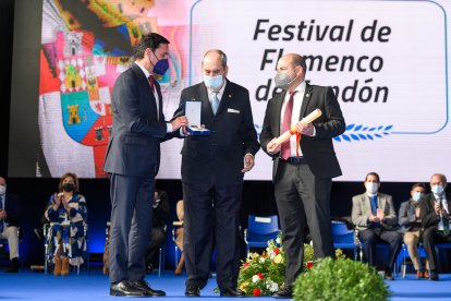 Medalla de Oro de la Cultura 2020 al Festival de Flamenco de Fondón. La recogen el organizador del Festival, José Antonio López Alemán, y el alcalde de Fondón, Valentín Martín Ramírez.