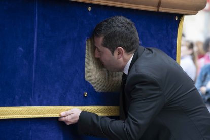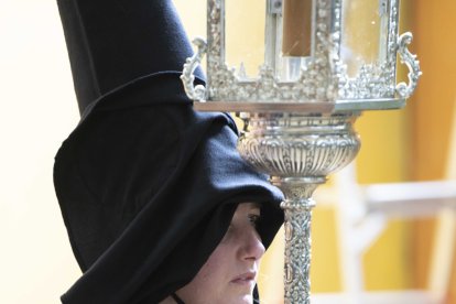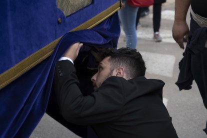 Un joven cofrade del barrio de El Zapillo, con su Cristo del Gran Poder.