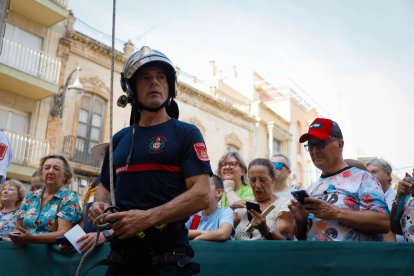 La alcaldesa recibe las flores que descendió un bombero desde la grúa.