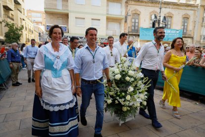 La alcaldesa y los concejales, vestidos con el traje regional almeriense en la ofrenda floral a la Virgen del Mar.