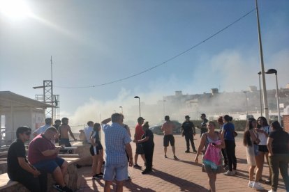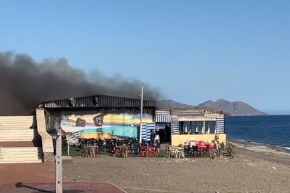 Un fuego originado en la cocina del chiringuito Mar Azul de Retamar ha provocado un gran incendio que, a su vez, ha originado una llamativa nube de humo negro. Los bomberos trabajan para acabar con las llamas.