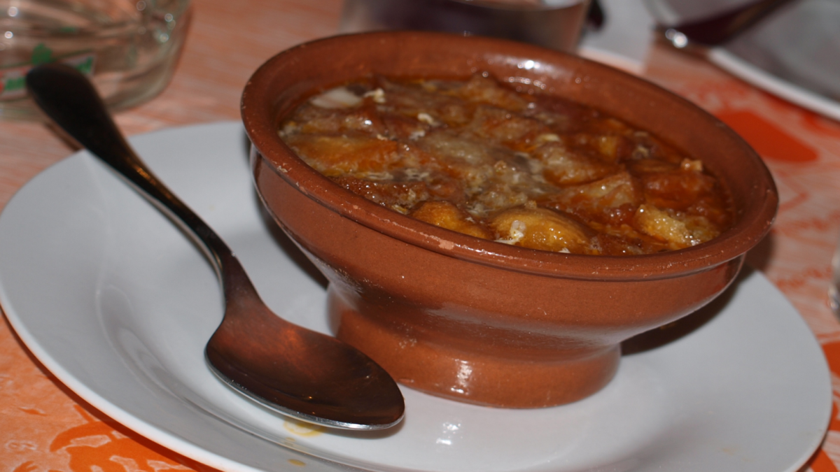 Paso 2. Se hace un sofrito con la cebolla y un poco de tomate, mientras en el mortero se machacan los ajos y los pimientos secos que teníamos reservados, a los que se le añaden comino, un poco de pimienta, pimentón y colorante; y se añade al sofrito cuando esté listo.