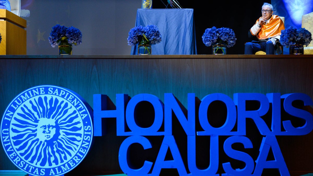 El paraninfo vistió sus mejores galas para ser testigo de una ceremonia histórica, en que un empresario en mayúsculas, sube al Olimpo del conocimiento, de la ciencia, de la cultura y del saber recibiendo en el solemne acto y cumpliendo el más alto protocolo: El Birrete Laureado, el Anillo de la Sabiduría, el Libro de la Ciencia y los guantes blancos.