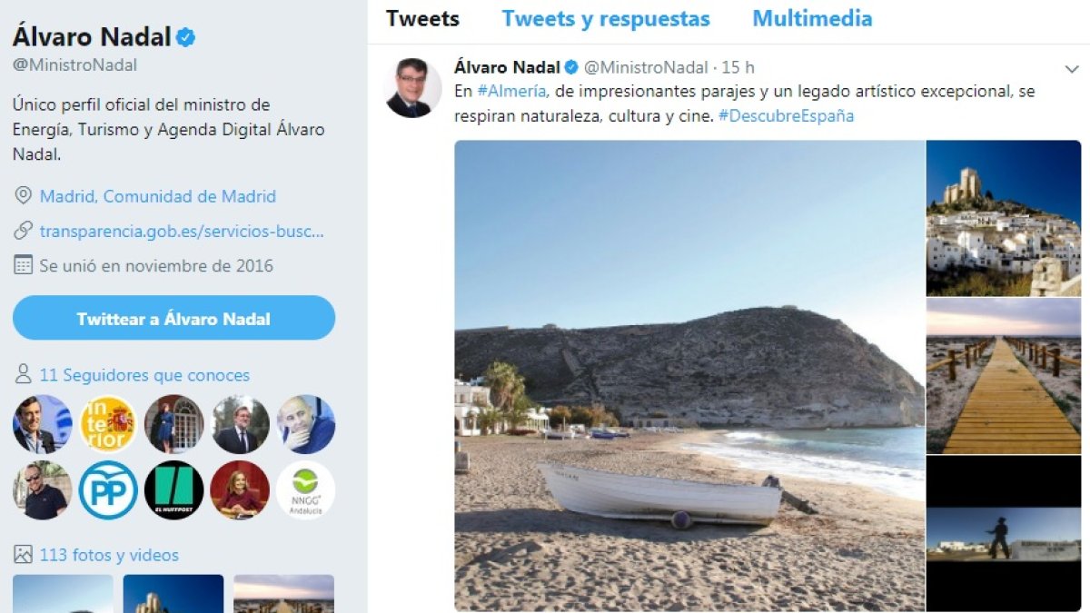 El ministro de Energía, Turismo y Agenda Digital, Álvaro Nadal, ha compartido en su perfil oficial de Twitter varias imágenes de la provincia de Almería, dentro de una serie de publicaciones sobre diversos rincones turísticos de la geografía española que el miembro del Ejecutivo de Rajoy está difundiendo este verano con la etiqueta #difundeespaña.