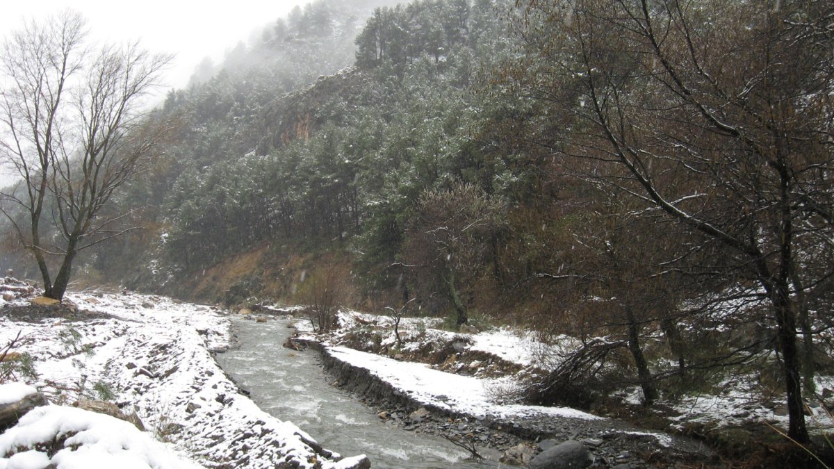 Deliciosa imagen de un bosque cruzado por un río. ¿De un país nórdico, quizá de Escandinavia? No, es de la provincia de Almería, concretamente del nacimiento del río Andarax. Algunas veces en invierno suele nevar.