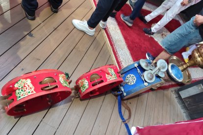 Instrumentos de percusión utilizados en el espectáculo musical, colocados en el suelo durante el descanso.