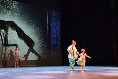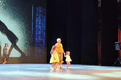 Los niños de las escuelas infantiles del Centro de la Mujer suben al escenario para proyectar un vídeo y para entregarle un ramo a su profesora.