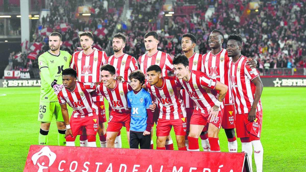 Baba formaba pareja con Lopy en el doble pivote y el puesto del sancionado Baptistao le fue adjudicado a Robertone. Como punta de lanza el Choco Lozano en el que ha sido su estreno como jugador del Almería ante la afición. Luis Suárez y Koné completan el repóker de bajas de los de Garitano.