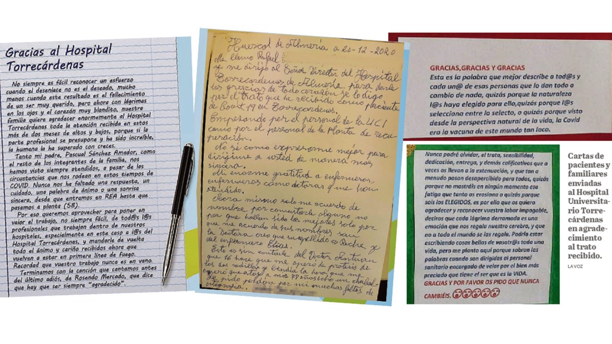 Desde que se inició la pandemia, el ‘buzón’ de Torrecárdenas se ha convertido en fiel reflejo del sentimiento de deuda que albergan los pacientes que reciben el alta hospitalaria para regresar a sus casas. Se trata de cartas que curan a los que curan. Pero los que las escriben no son solo personas que han pasado por el trance de la Covid-19. Sin ir más lejos, otra que destaca por su ternura lleva la firma de Alejandro, un bebé prematuro que tuvo la “ocurrencia de nacer en estos tiempos”.